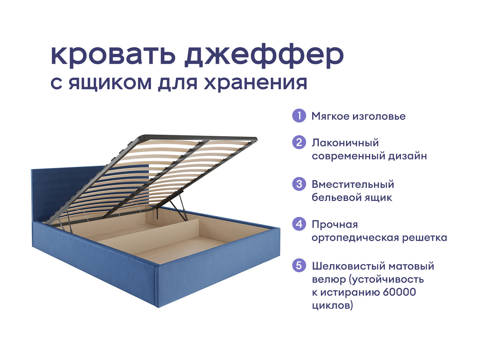 Выполнена в стиле минимализм. Простой, но выразительный образ отличается эргономичностью конструкции и особенным комфортом в эксплуатации. Компактное изголовье легко впишется в самые смелые решения. Конструкция кровати изготовлена из ДСП, обивка из велюра. В комплект входит ортопедическое металлическое разборное основание с подъемным механизмом.