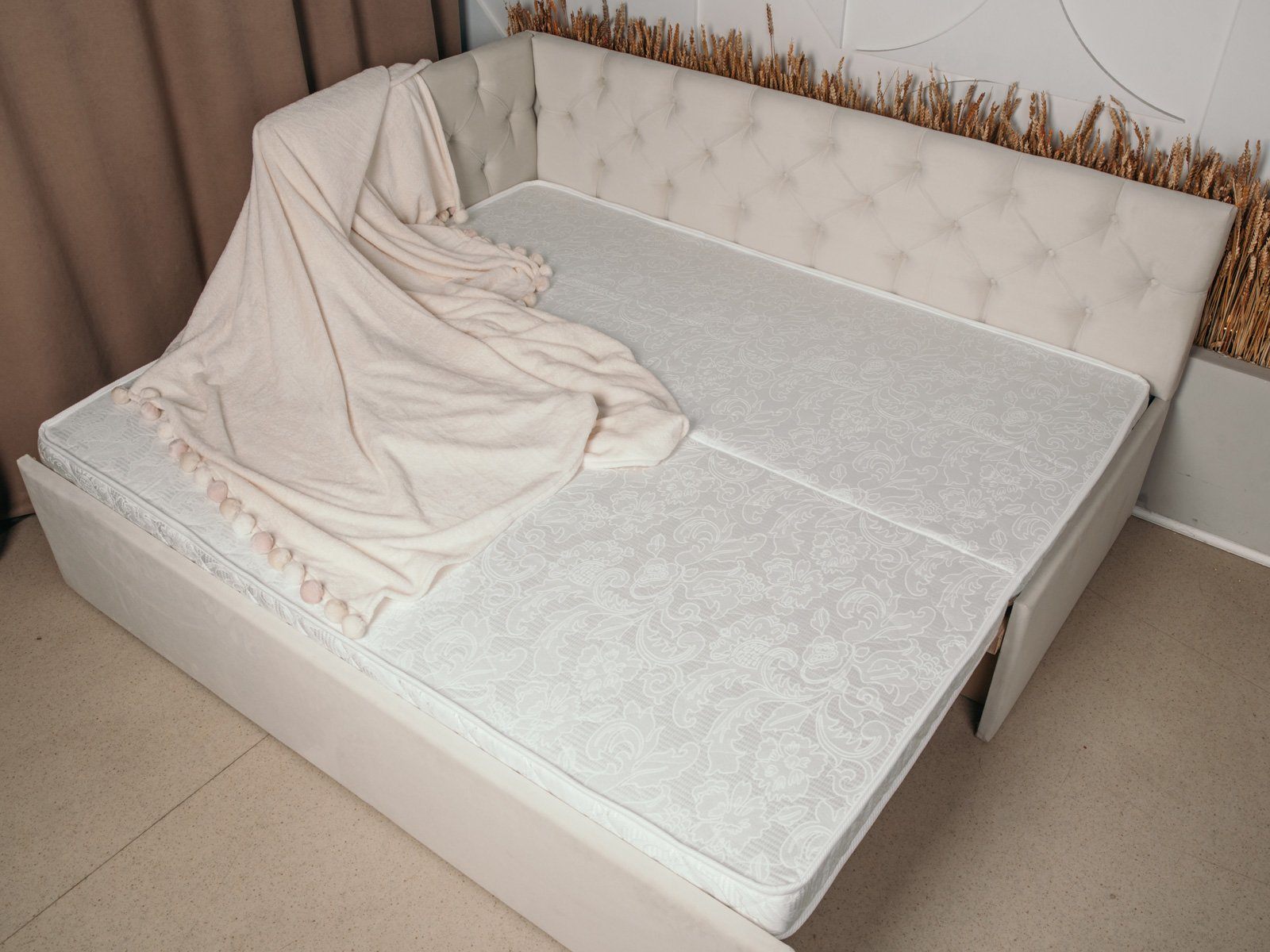 Кровать комплектуется раздвижным основанием, которое лёгким движением руки превращает односпальную кровать в двуспальную. Модель позволит сэкономить пространство в помещении, не жертвуя при этом вашим комфортным сном.