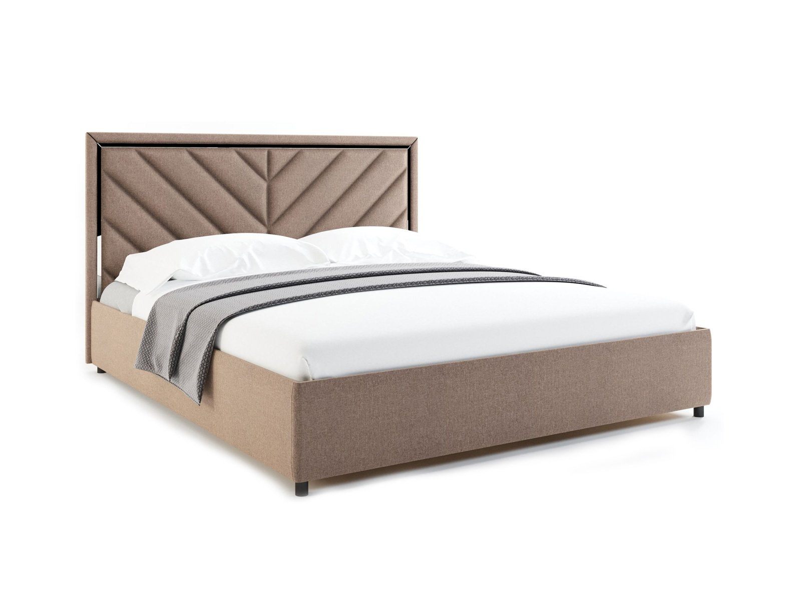 Виктория — кровать с высоким изголовьем в современном стиле. Изюминка модели — высокое мягкое изголовье с диагональными стяжками и зеркальной вставкой по периметру, которая создает яркие блики на свету.
