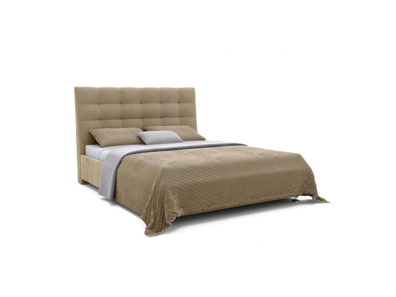 Современная модель среди интерьерных кроватей. Оригинальный рельеф изголовья, выполненный в виде квадратов с декоративной строчкой задает определенный ритм всему интерьеру спальни.