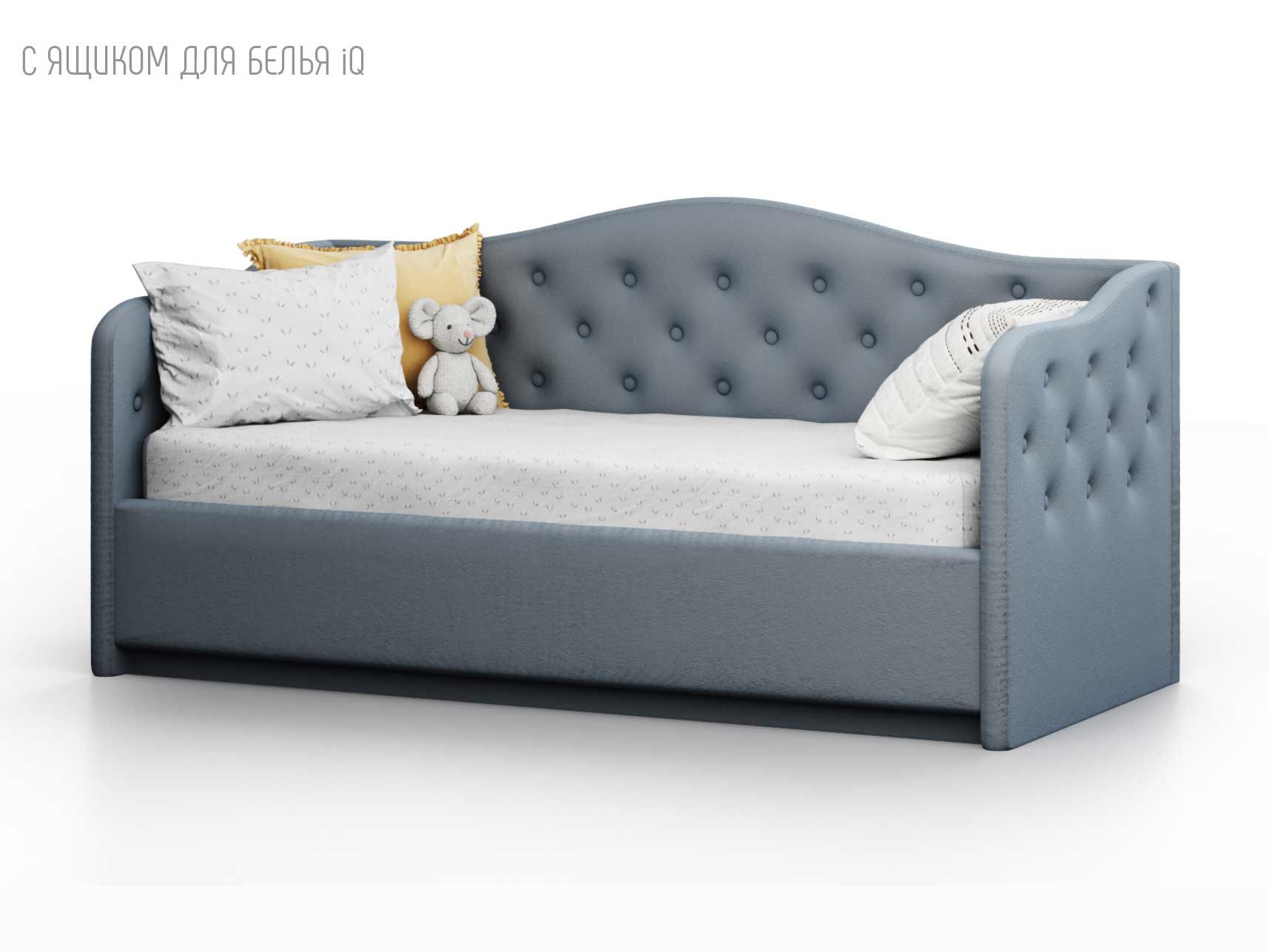 Кровать укомплектована IQ с подъемным механизмом и ящиком для белья без дна (дополнительная платная опция - дно к ящику IQ из HDF (ХДФ). Каркас кровати на цоколе, декоративный чехол на цоколе съёмный. Глубина ящика для белья - 30 см, без ограничения нагрузки на ящик.