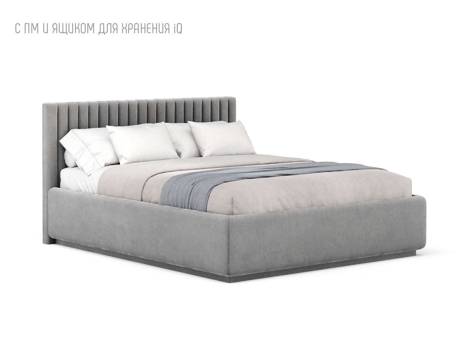 Кровать укомплектована IQ с подъемным механизмом и ящиком для белья без дна (дополнительная платная опция - дно к ящику IQ из HDF (ХДФ). Каркас кровати на цоколе, декоративный чехол на цоколе съёмный. Глубина ящика для белья - 30 см, без ограничения нагрузки на ящик.