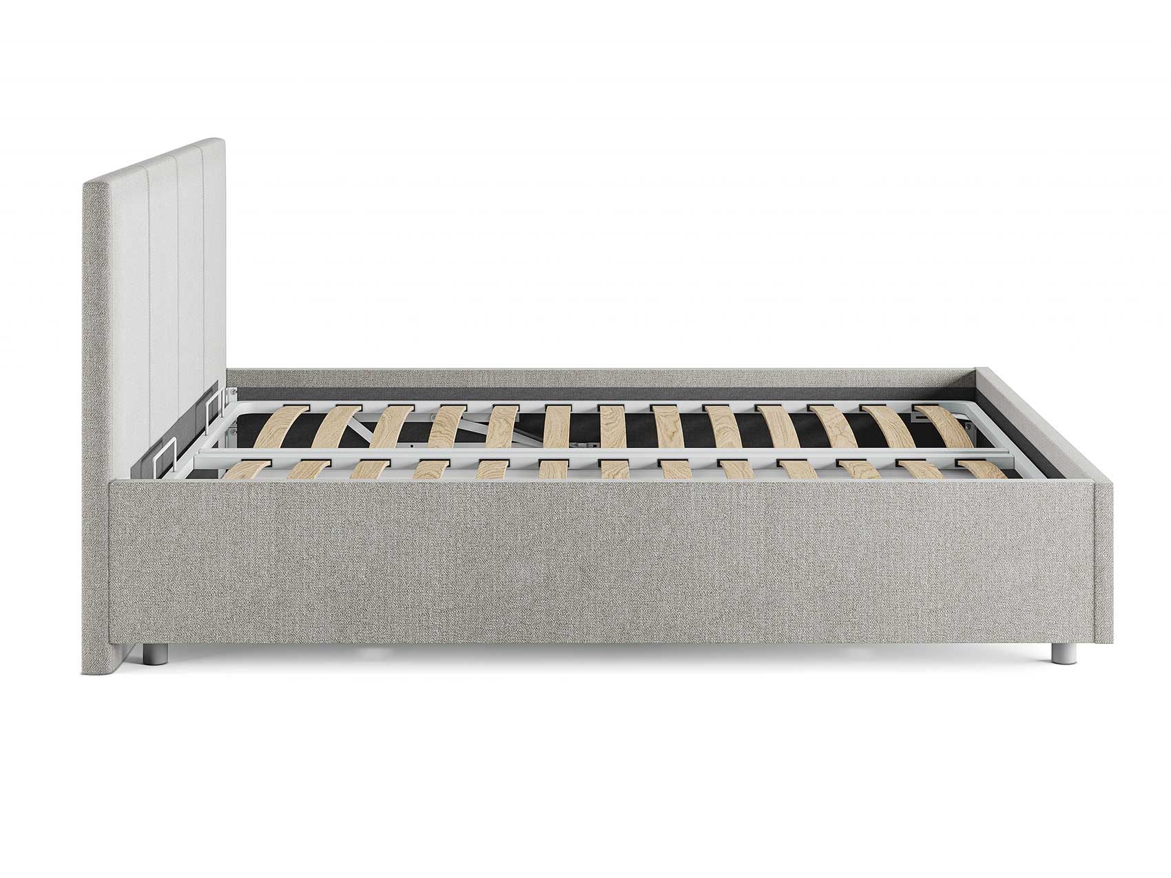 Кровать комплектуется металлическим основанием и подъемным механизмом со вместительным бельевым ящиком. Дно бельевого ящика легко сдвигается для обеспечения уборки под кроватью.