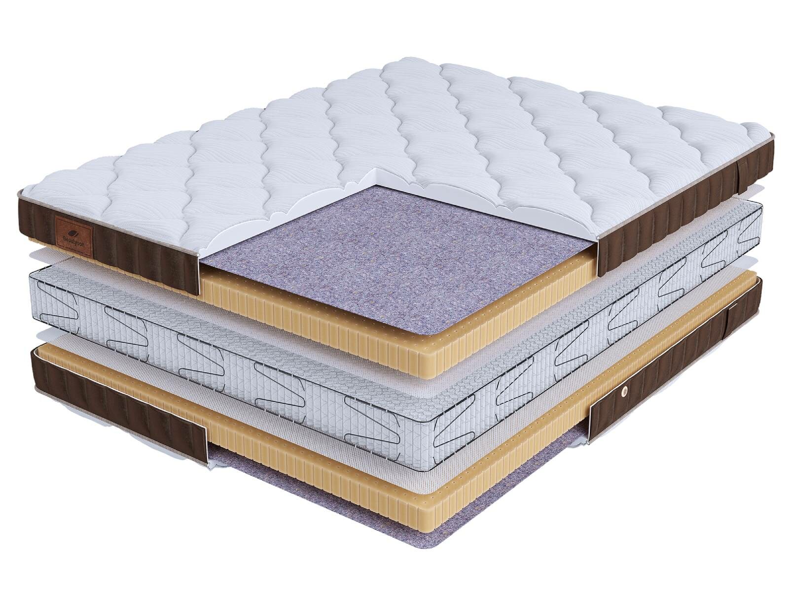Хлопковая трикотажная ткань чехла обеспечивает комфорт и обладает отличной воздухопроницаемостью. Высокообъемная стежка с использованием холлофайбера (600гр.) подарит дополнительный комфорт спальному месту. Изысканный бурлет из мягкого велюра красивого бежевого цвета придает матрасу роскошный внешний вид и подчеркивает его премиальный статус. Каждая модель серии LIFE украшена фирменной кожаной биркой BeautySon, подтверждающая исключительность каждого матраса.