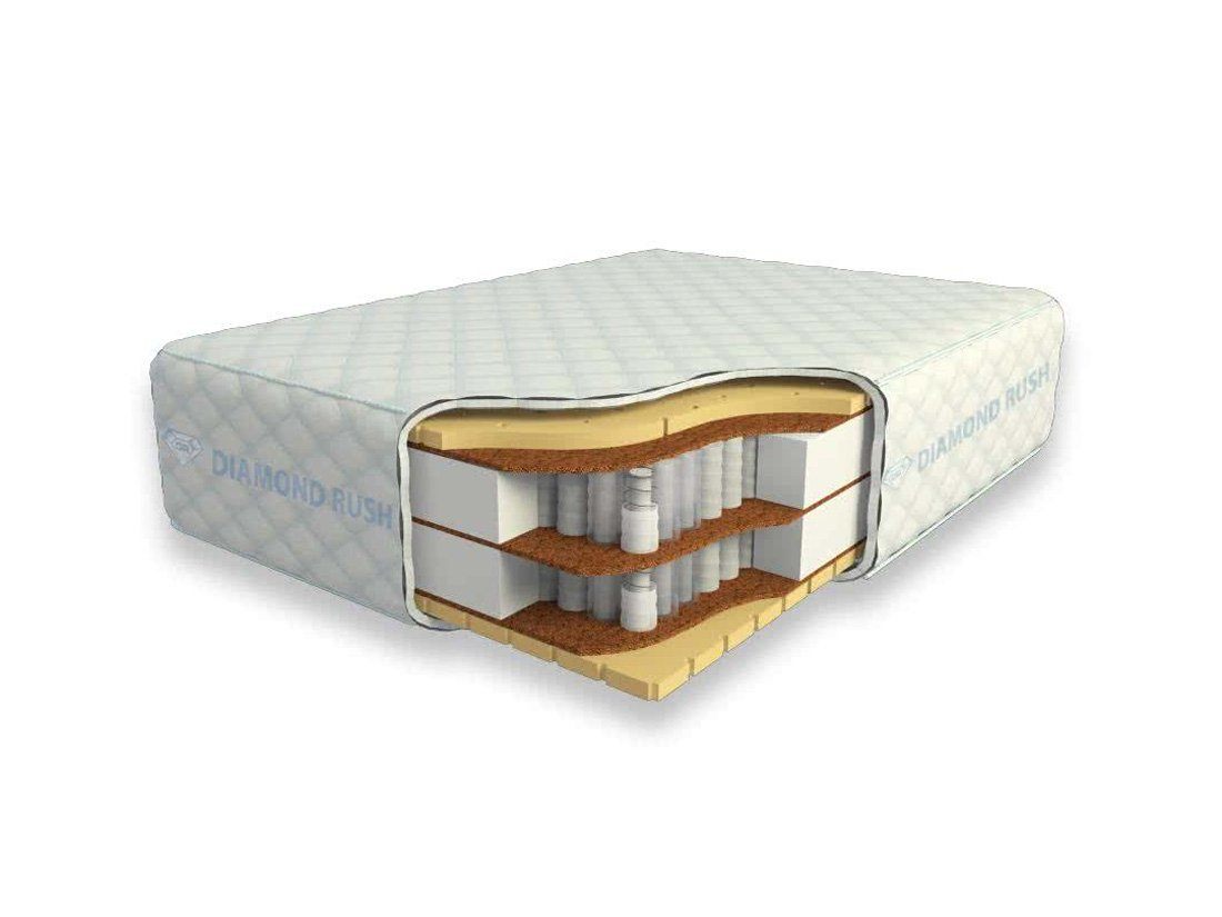 Матрас из серии Luxury Diamond имеет в своей основе двухъярусный независимый пружинный блок DP, состоящий из сдвоенных пружин диаметром 3-4 и 5-6 см. В качестве настилочных слоев поверх пружинных блоков используются листы латексированной кокосовой койры в сочетании с натуральным перфорированным латексом. Стороны имеют одинаковую среднюю жесткость.