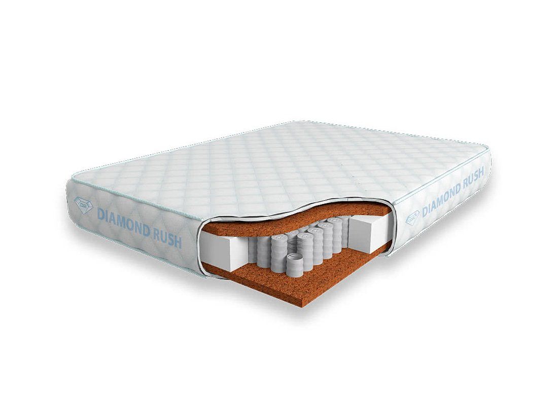 Матрас Diamond Rush Full Cocos 725DR имеет в своей основе независимый пружинный блок 725, состоящий из пружин диаметром 5-6 см. В качестве настилочных слоев поверх пружинного блока используются листы толщиной 3см латексированной кокосовой койры. Это один из самых жестких материалов, однако он позволяет в полной мере ощутить на себе ортопедический эффект от пружинного блока.