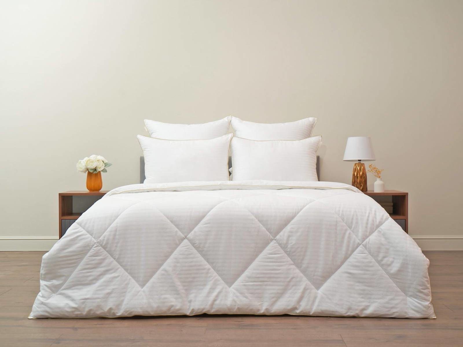 Особенности пошива: двойная отстрочка по краю одеяла, декорировано золотым кантом. Стежка одеяла - ромб;