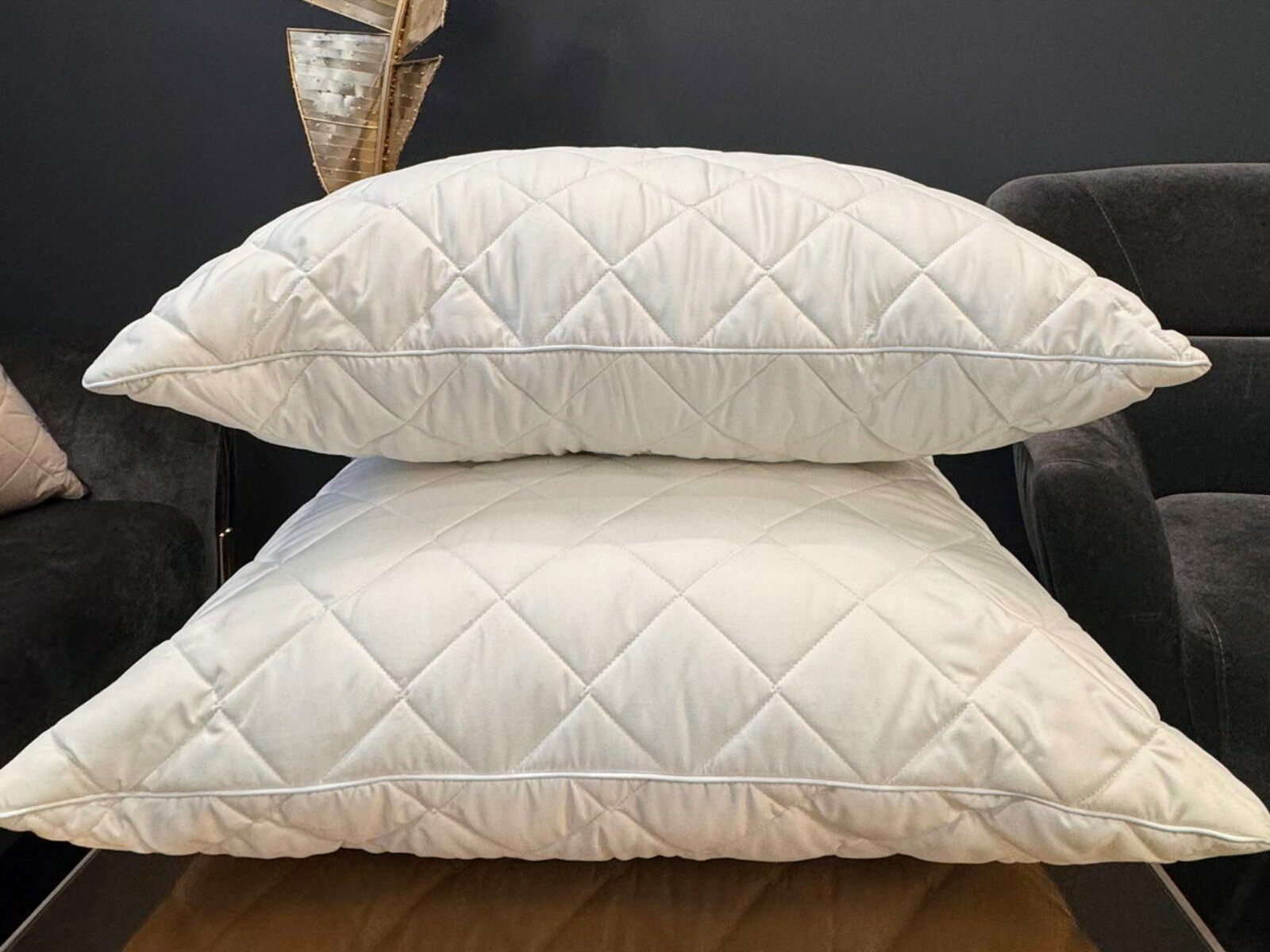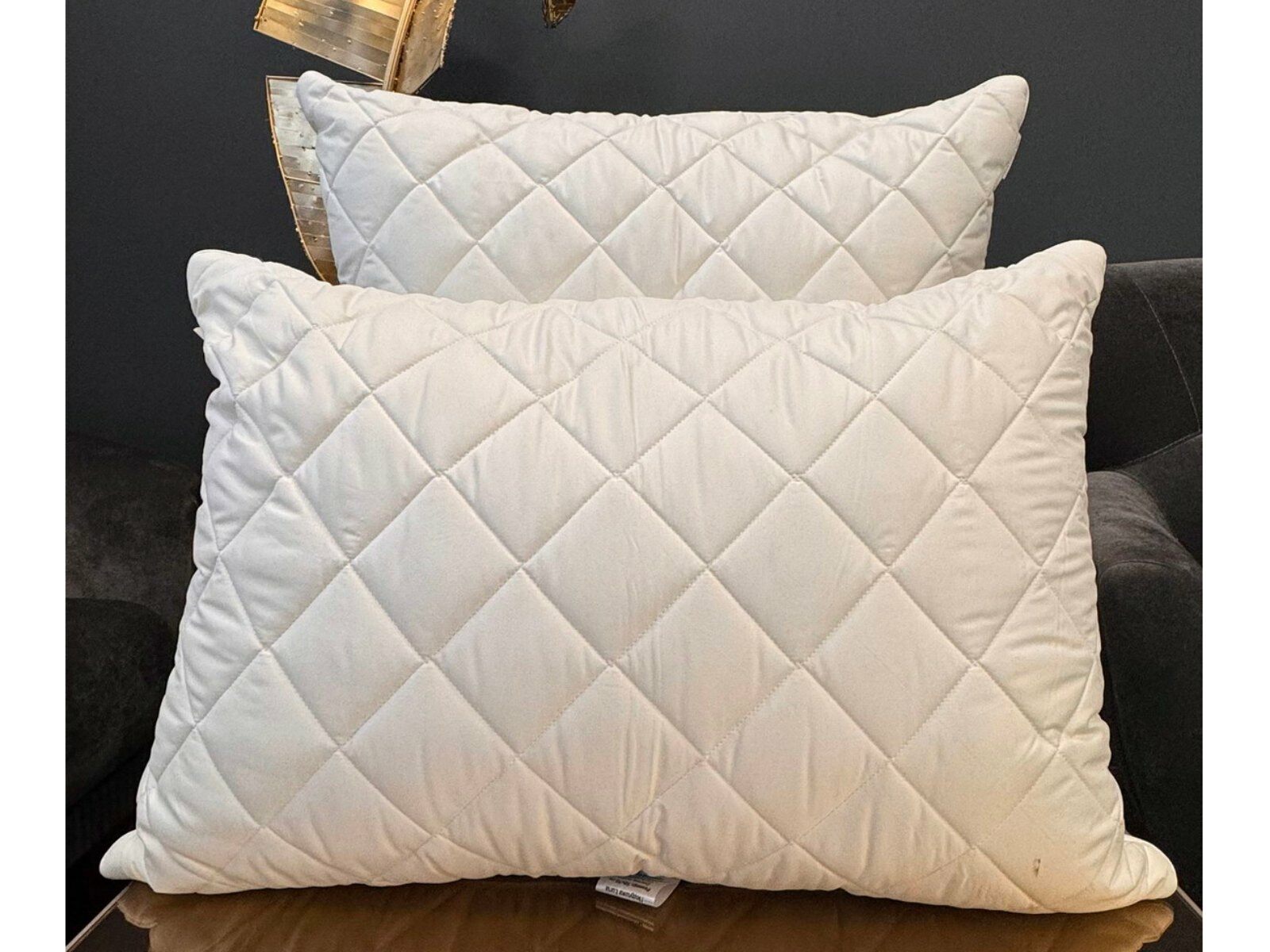 Наполнителем для подушек служит искусственный лебяжий пух, он обладает отличной формоустойчивостью, не сбивается в комки и прост в уходе. Особенность данной модели - уникальная стежка «ромбы», которая хорошо переносит ежедневную эксплуатацию, без потери своих качеств.