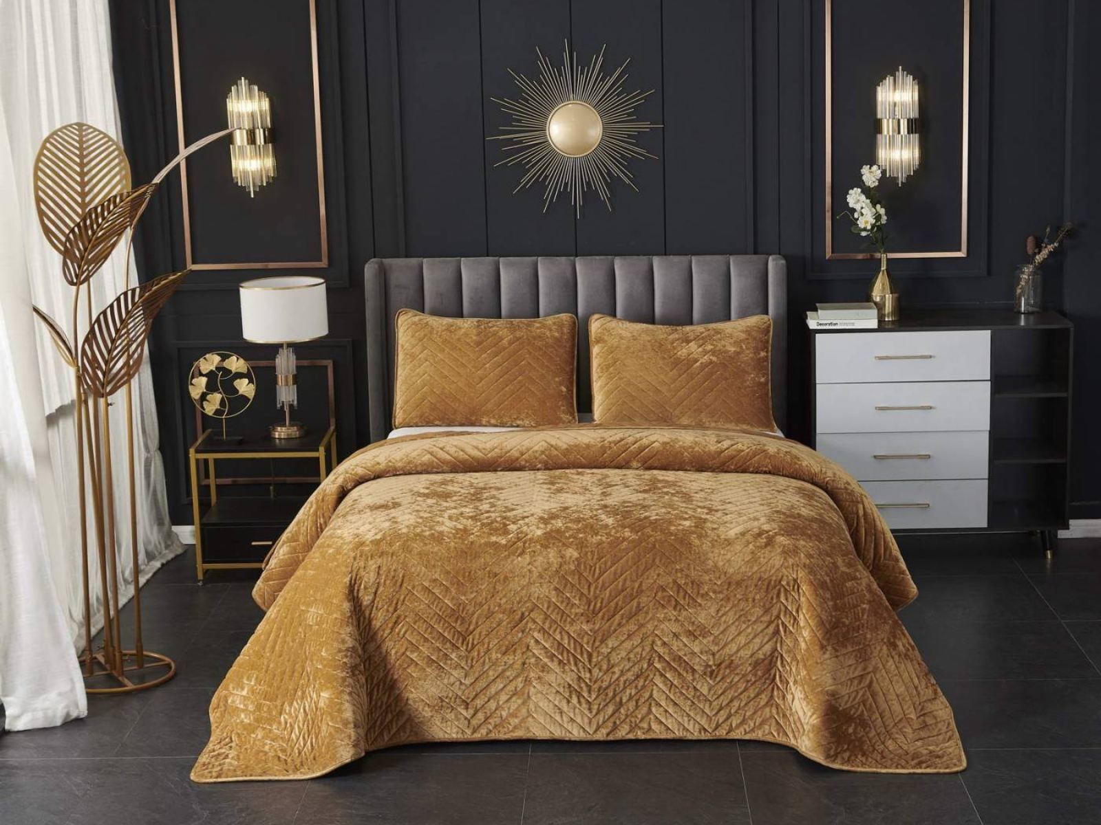 Покрывала Фернанд выглядят как будто сошли с картин, изображающих королевские покои. Бархатную ткань начали изготавливать еще в Средние века, её использовали в оформлении дворцов и изготавливали плащи и головные уборы для знати. Теперь и вы можете прикоснуться к этой роскоши! Бархатная текстура приятная на ощупь, а из-за особого плетения ткани, игра света на ней выглядит благородно. Поэтому покрывало Фернанд создаст необычайно уютную атмосферу в вашей спальне. Цветовая гамма разнообразна и включает восемь благородных оттенков: капучино, бежевый, изумруд, горчичный, терракотовый, пепельная роза, серый, стоун. За покрывалом Фернанд легко ухаживать: стирка при температуре 30 градусов, вручную или в машинке. Важно хорошо просушить изделие! При правильном уходе вещь прослужит долгие годы не потеряв форму и цвет.
