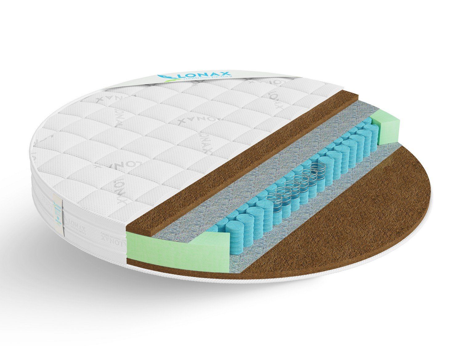 В модели "Lonax Cocos" используется латексированная кокосовая койра - 100% натуральный жесткий материал, изготавливаемый из пролатексированных кокосовых волокон.