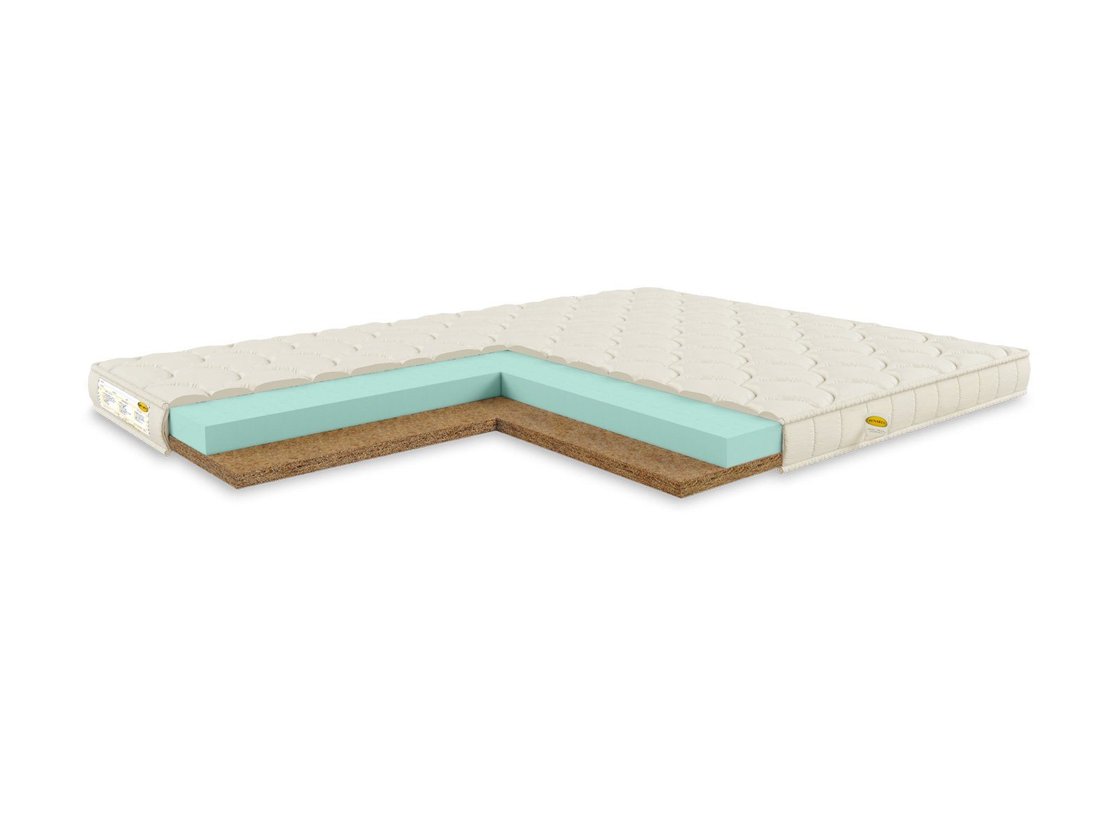 Матрас складывается из искусственного латекса и кокосовой койры. На первый наполнитель приходится 6 см, на второй – 3 см. Каждая из сторон матраса приобретает свою степень жёсткости – среднюю и высокую. Белее мягкая поверхность реализована с помощью искусственной пены.