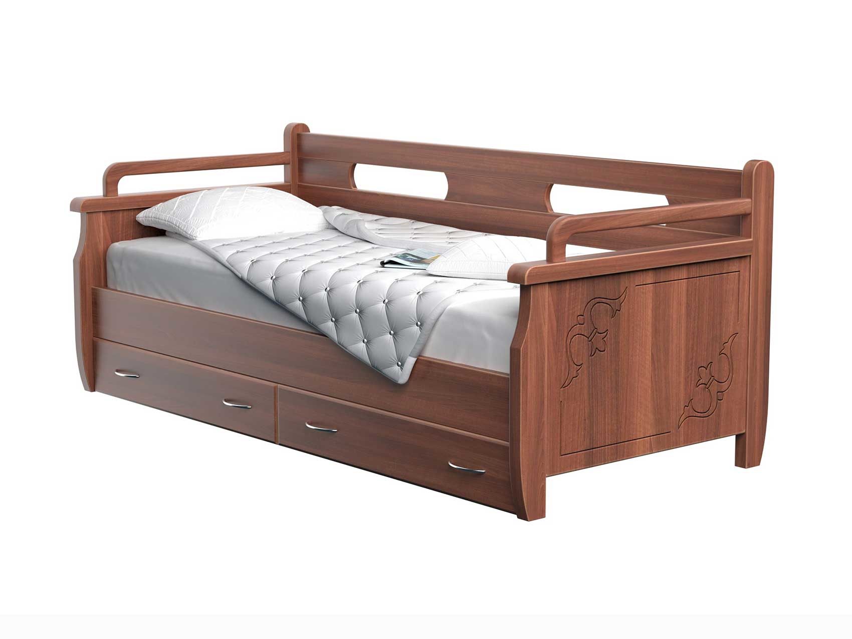 Живая классика для Вашего интерьера. Как и у всех моделей кроватей практичность и универсальность кровати, возможность комплектования как выкатными ящиками, так и ящиком для белья из массива или ЛДСП с подъемным механизмом фронтального или бокового открытия являются неоспоримыми преимуществами этой модели. Стандартно не комплектуется выкатными ящиками, ящики заказываются и оплачиваются отдельно. Задняя спинка — 85 см., боковые поручни — 75 см.